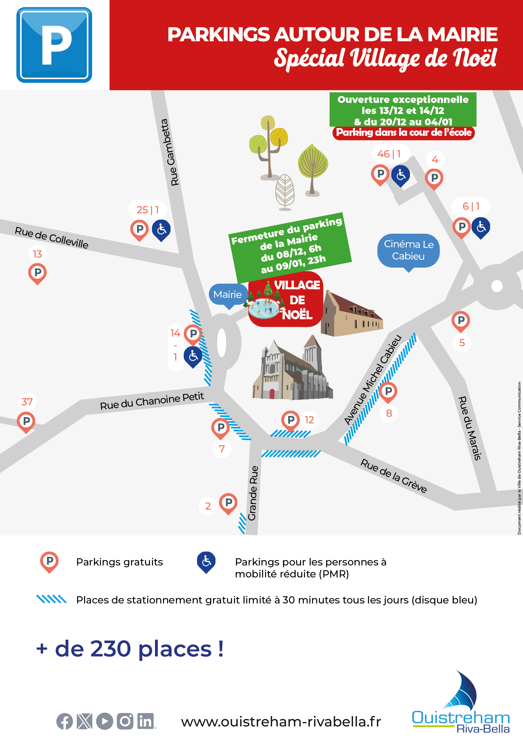- Stationnement interdit sur le parking de la Grange aux Dîmes du 8 décembre, 6h, jusqu’au 9 janvier, 23h. Le parking du Cinéma Le Cabieu sera agrandi provisoirement pendant les week-ends et vacances scolaires. Vous retrouvez également les parkings habituels présents sur la place Albert Lemarignier et route de Colleville.