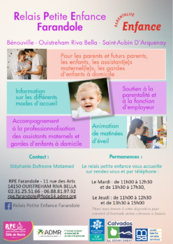 Les Relais Petite Enfance « Ritournelle », « Farandole » et « Fabulette » sont gérés par l’Association Départementale Petite Enfance ADMR pour le SIVU des RPE de la Côte de Nacre, qui réunit dix communes. Ce service public gratuit a pour objectif d’accompagner les parents, les assistants maternels et les personnels de garde à domicile à se rencontrer et à mieux s’informer.