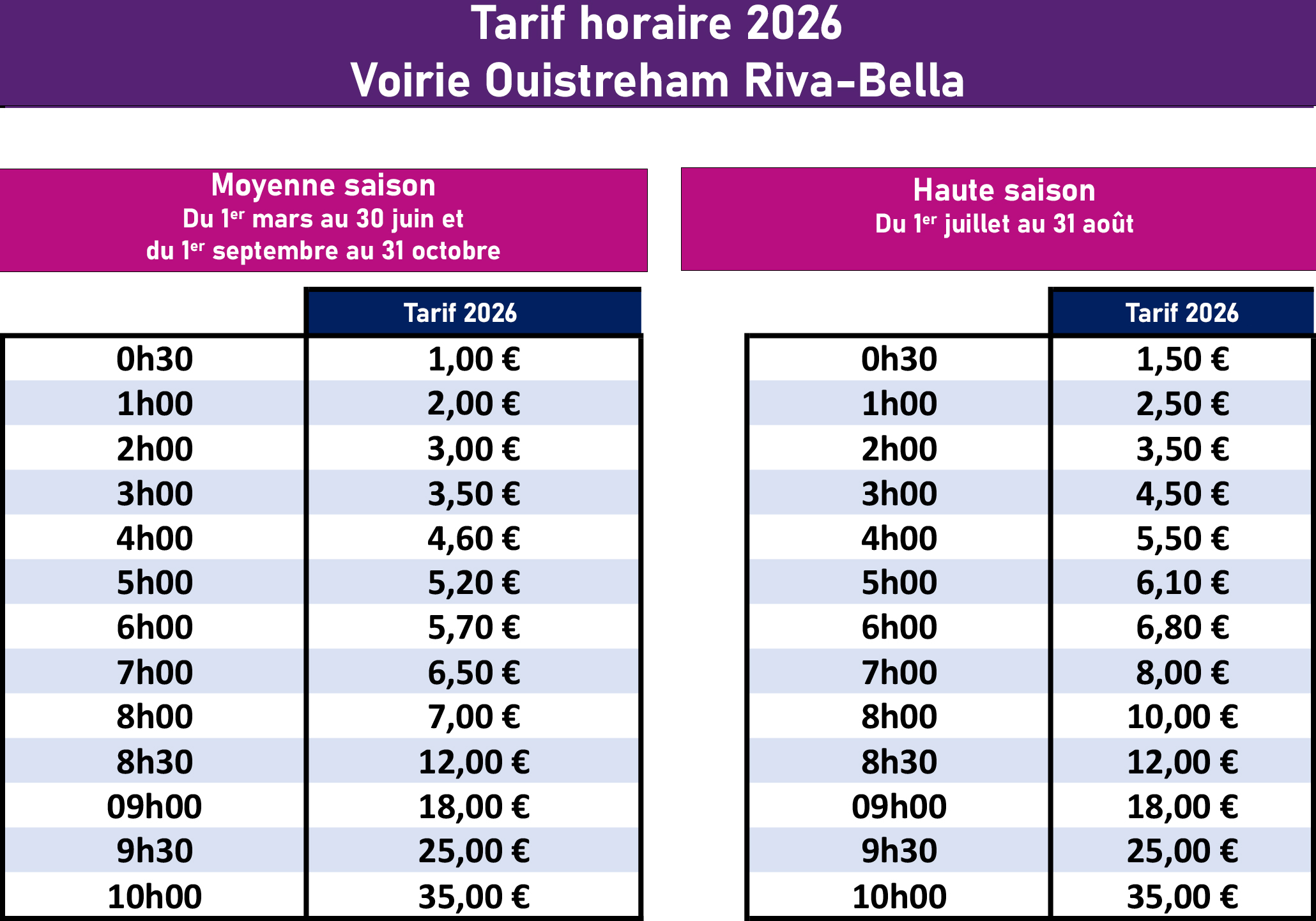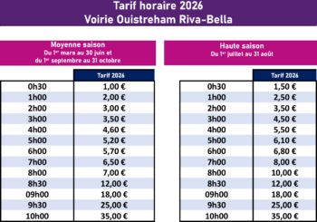 - Moyenne saison et haute saison (du 1er mars au 31 octobre) : payant – Gratuité pour les résidents Ouistrehamais